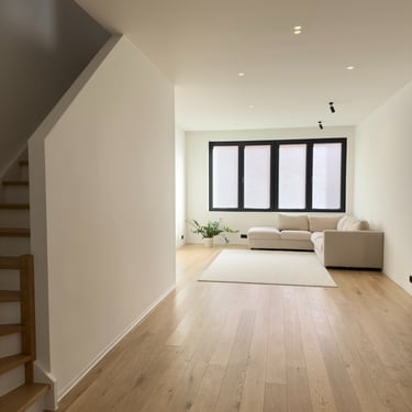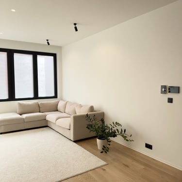 Une fois la chape de finition sèche, nous avons installé le parquet en chêne semi-massif et les plinthes. Nous avons ensuite appliqué une peinture satinée sur l’ensemble des surfaces pour créer un espace clair et épuré. Nous avons fini par l'installation des spots lumineux, les caches des prises et intérrupteurs, le thermostat et le visiophone.