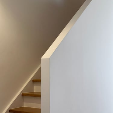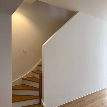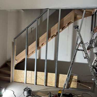 Après la pose du système de chauffage, nous avons poursuivi avec la chape, le plafonnage complet et la création du garde-corps de l'escalier avec des cloisons sur ossature métallique. Nous avons ensuite finalisé l'installation électrique, le système de ventilation et la plomberie pour venir fermer les gaines techniques et préparer les mûrs pour les finitions finales.