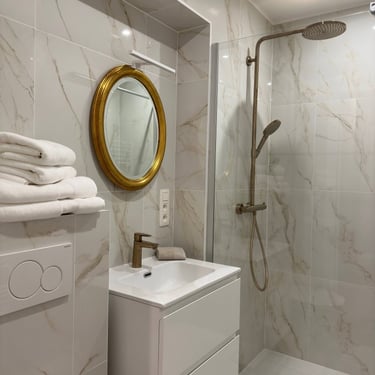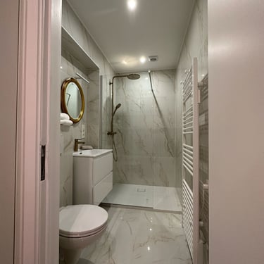 La salle de bain a été entièrement rénovée : nouvelle plomberie, pose de carrelage grand format effet marbre, installation d’une douche à l’italienne moderne et d’un meuble lavabo design.